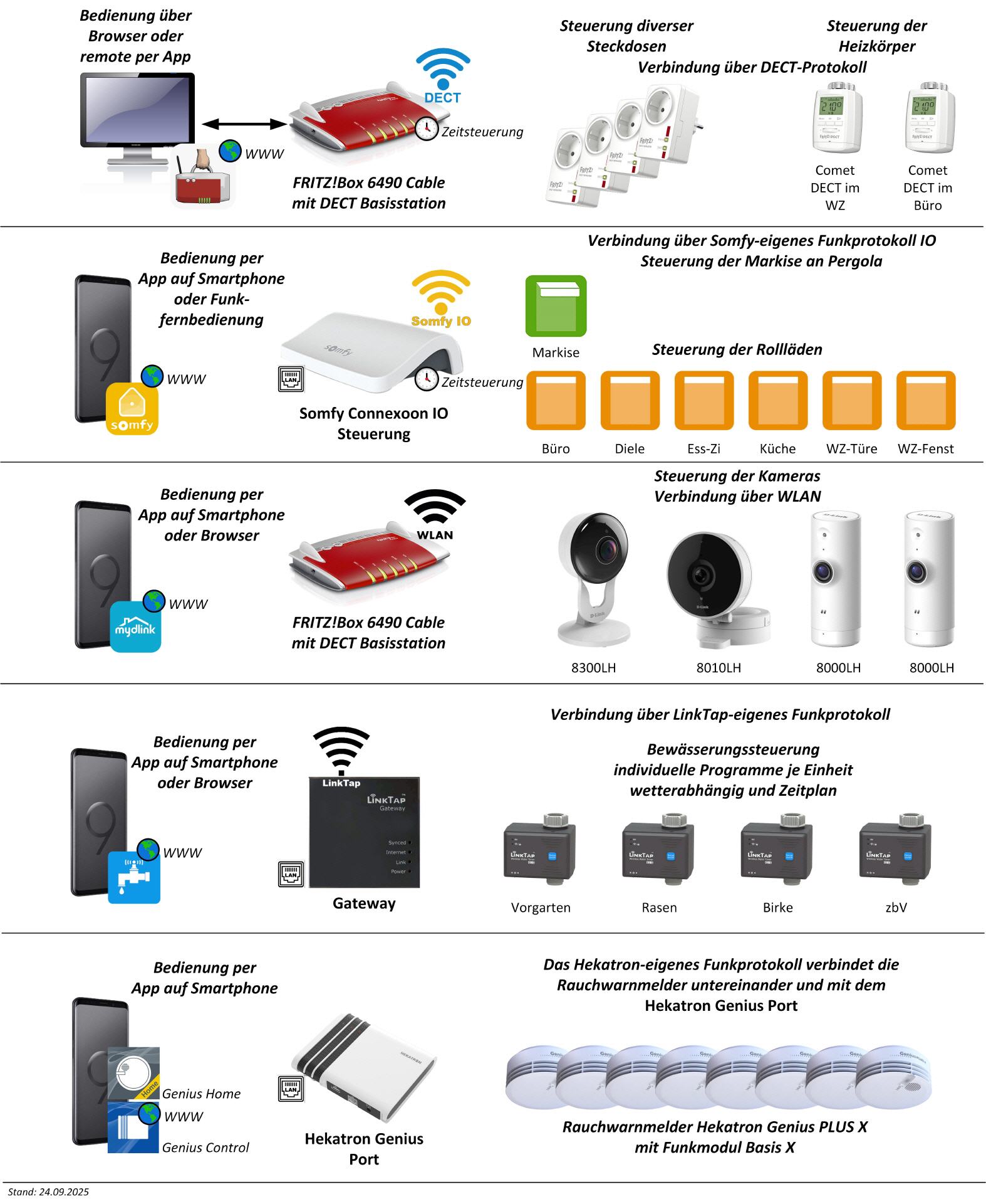 Für die Steuerung diverser Geräte im Haus und Garten setzte ich folgende Produkte ein. Sie sind jeweils nach Einsatzzweck und unter Kostengesichtspunkten ausgewählt. Leider ist aufgrund der unterschiedlichen Übertragungsprotokolle und Cloud-Anbindungen kein einheitliches System möglich.